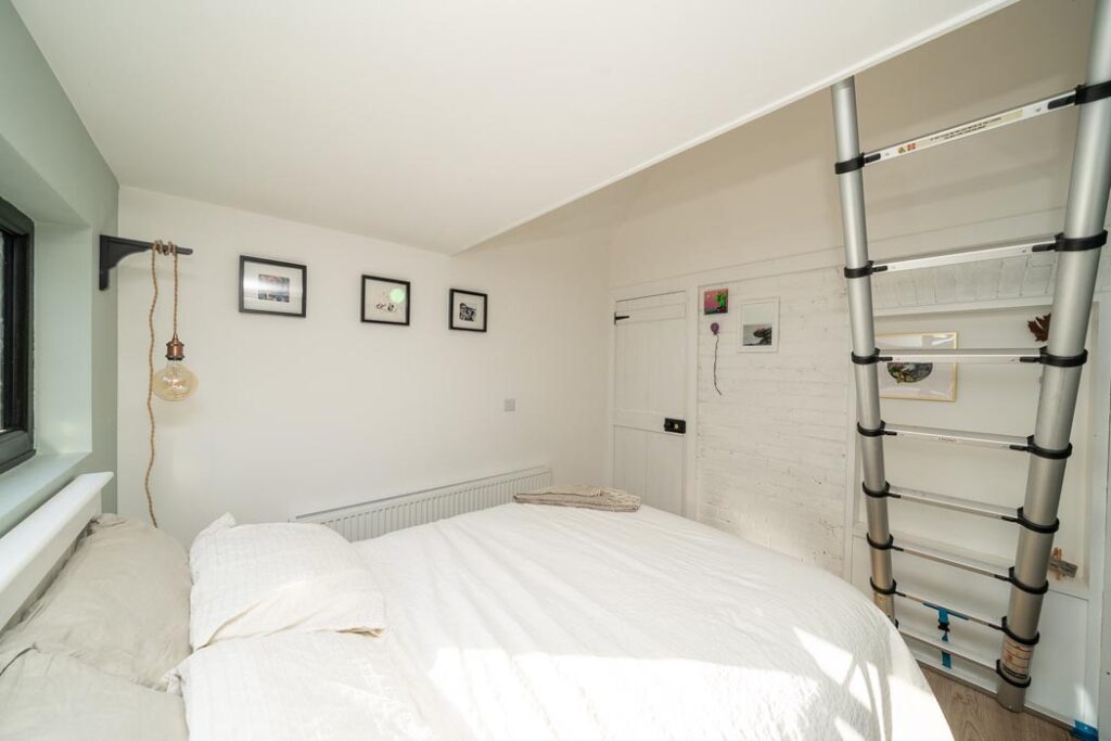 This drops the headroom level above the bed slightly to give you enough clearance above to be able to sit down at a desk. A triangular pane of glass spanning the full height and width of the space means you enjoy daylight, even on the darkest winter day.