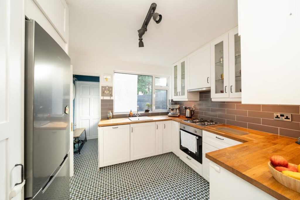 The kitchen is to the rear and has painted shaker door cabinetry and timber countertops, set in a C-shape. It leads through to a utility cum guest WC.
