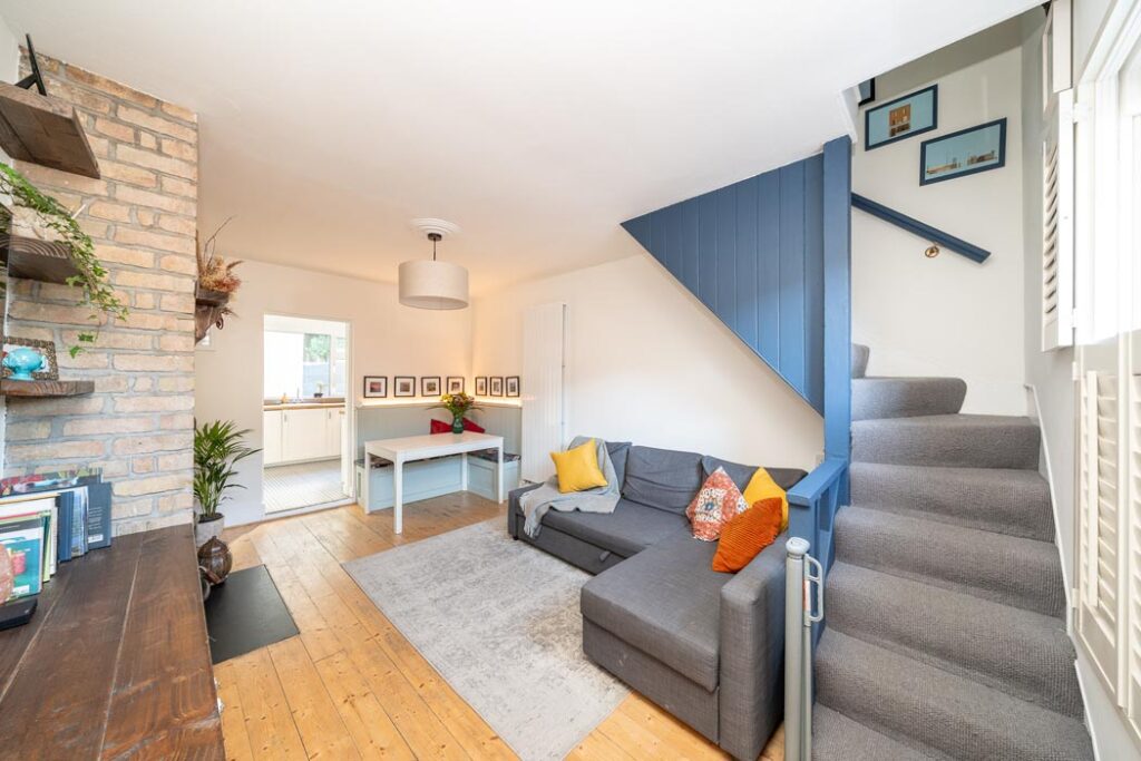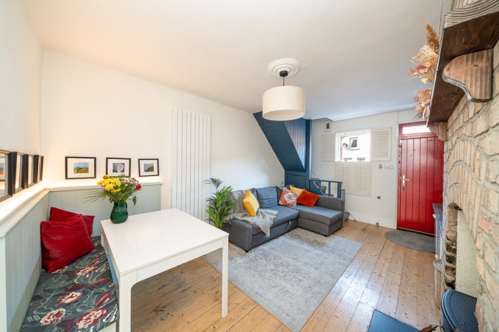 The focal point in the living room is the exposed Dolphin’s Barn brick chimney breast into which a solid fuel stove has been set.