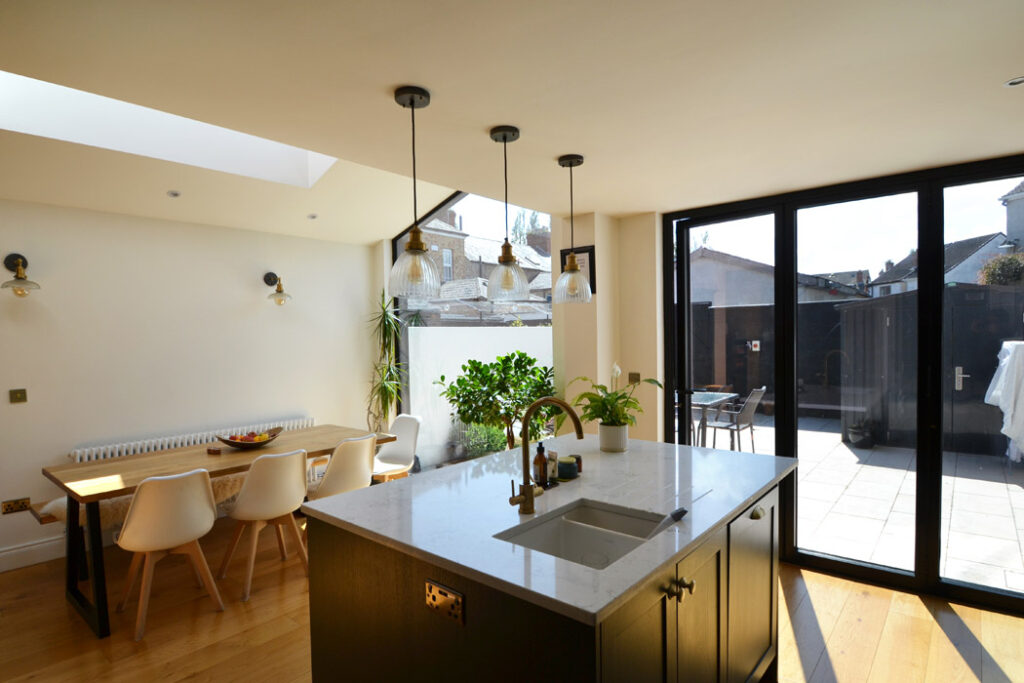 Across town in Drumcondra, Fallon used the empty space to the side of the return in this brick-built house to expand our space from the back room and kitchenette in the return to enclose this space.