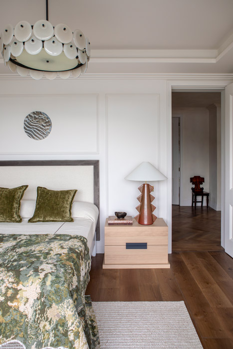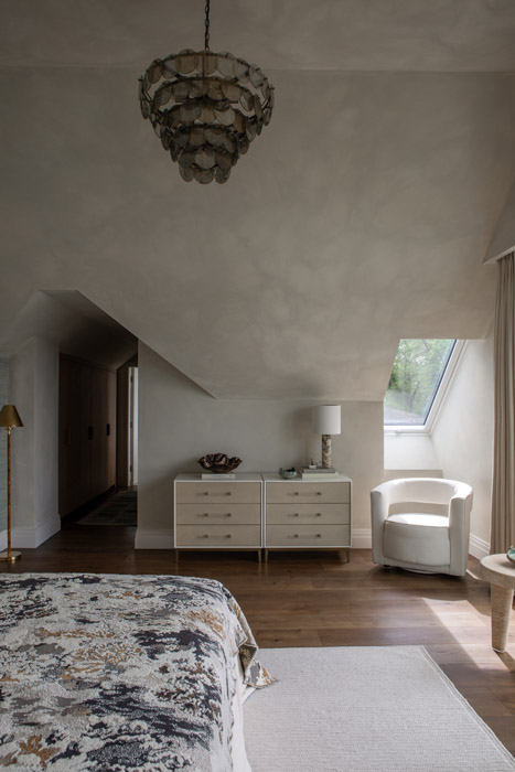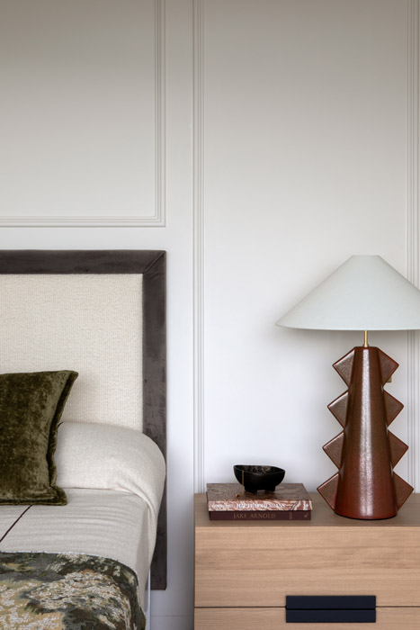The central pendant here is Heathfield Lighting. The bedside lamp here is Senso, available through Andrew Martin.