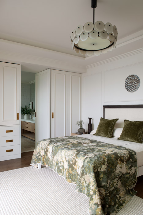 “Limestone with marble and wood gives it a serene feeling, which is close to the earth.” Textures such as jute rugs atop the oak flooring and sea grass papers used on the walls soften the mood.