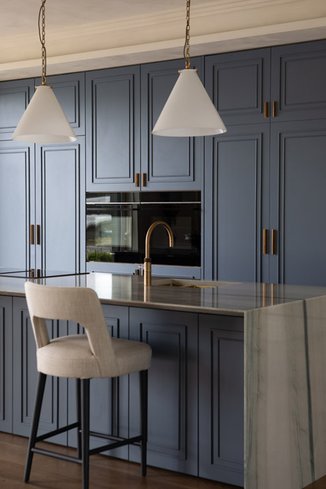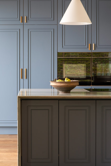 The kitchen is the only place where the big blue is referenced in any real visual way on the cabinet doors and island base, fabricated by Kenmare-based Holbein Carpentry & Joinery.