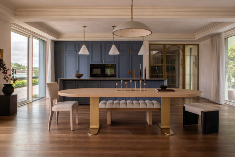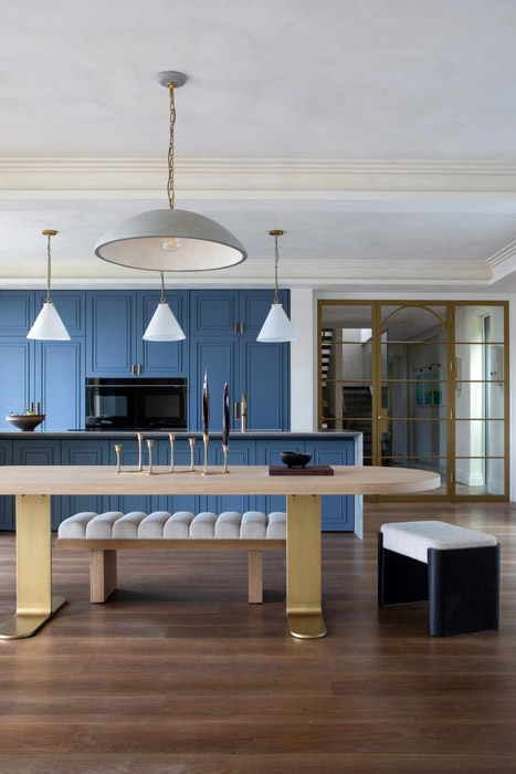 The dining area is beautifully elegant. It allows the oval-shaped table with brass feet, a custom piece by O’Toole, to do all the talking.