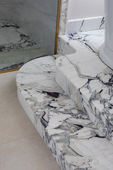 The bathrooms all have five-star hotel finishes. In the upstairs principal ensuite, breccia capriaia marble steps cascade down from the bath, which has been installed at an elevated height so you can soak up the views while in the tub.