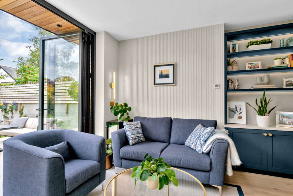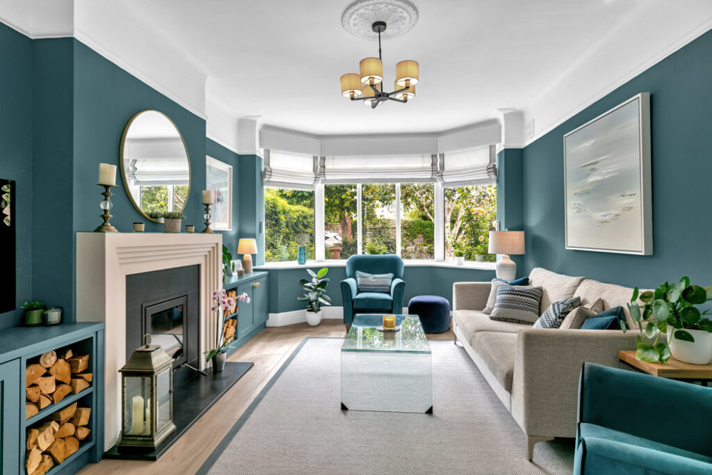 They hired Diana Molohan of My Kind of Design to help with the interior. She suggested the Eturia by Little Greene, a muted blue, for the living room. The designer wanted them to go even darker.