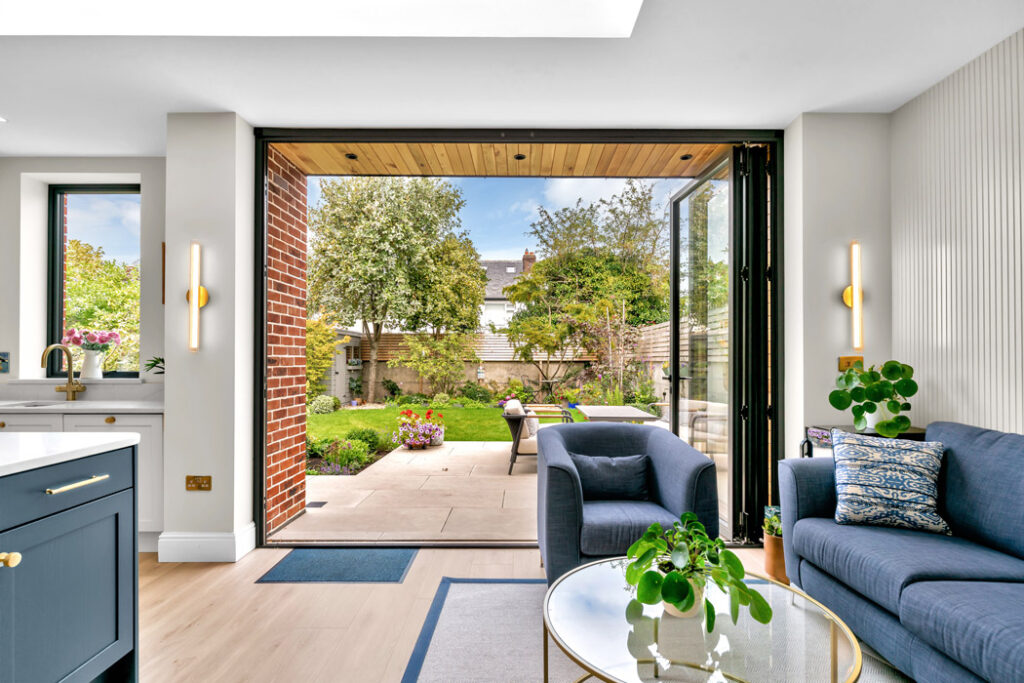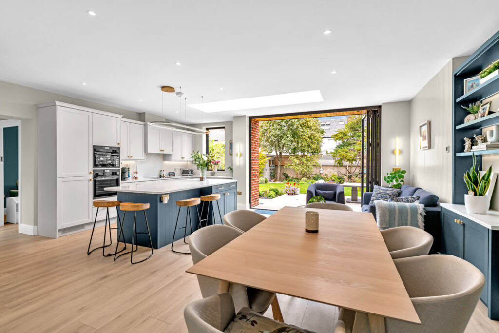 After: The open plan kitchen, dining room with a reading nook where double doors open out to the garden