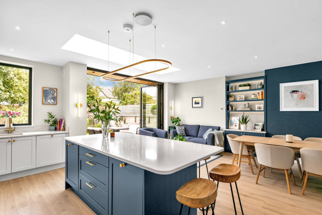 The kitchen island and units are picked out in Farrow & Ball’s Hague Blue with Ammonite on the back wall units. The injection of colour brings the home to life, decisions the couple felt they wouldn’t have been able to make without Molohan’s expertise.