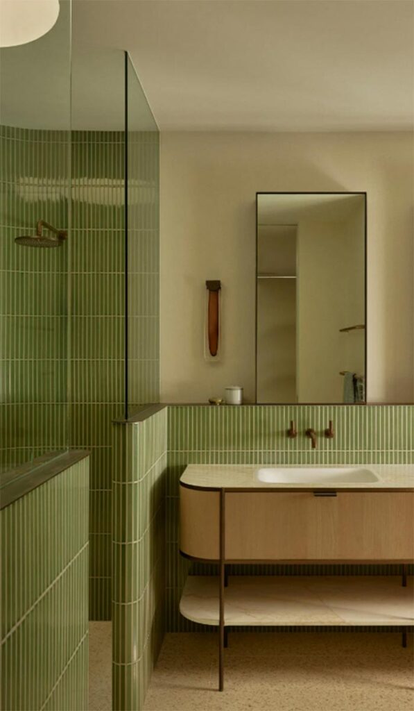 A colourist, who is at the top of her game, selected this set-up for the principal ensuite in a art deco house in South Yarra, as she explains: “Our clients wanted a beautiful space with intricate detailing and were open to introducing bold colour. We chose deep green gloss tiles whose earthy hue and reflective finish amplified the light and created a strong connection to the garden, which was central to the brief.