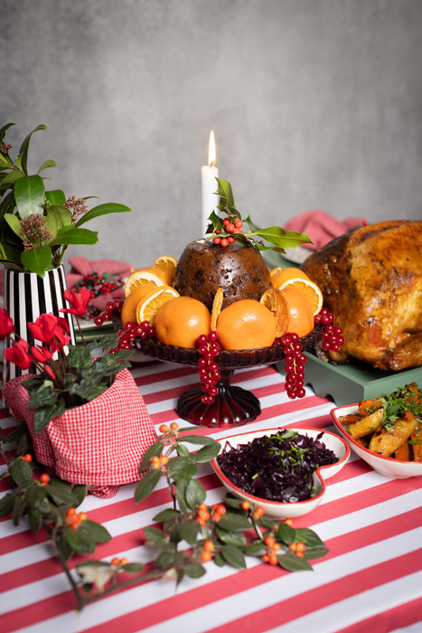 It’s a trope that comes through in the tableware that she serves her amuse-bouches in. But here it is, edible decorations that elevate the plum pudding’s look.