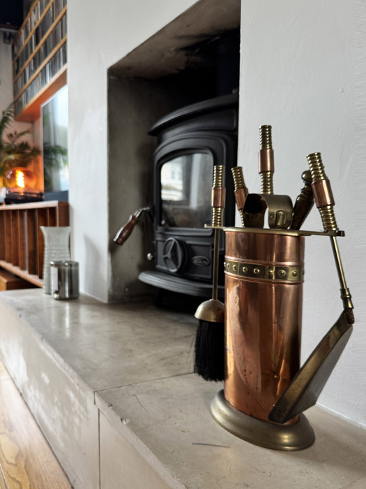 She installed a wood-burning stove to warm up winter nights. Placed on a raised plinth, it is set into the chimney breast.