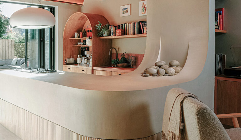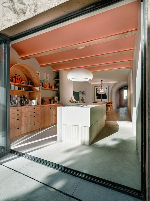 From here, the dominant features are the beautiful barrel-vaulted ceilings overhead as you step down into the very cool kitchen, complete with a peninsula featuring a curved microcement countertop, an aesthetic decision that was also more affordable than stone, Emily explains.