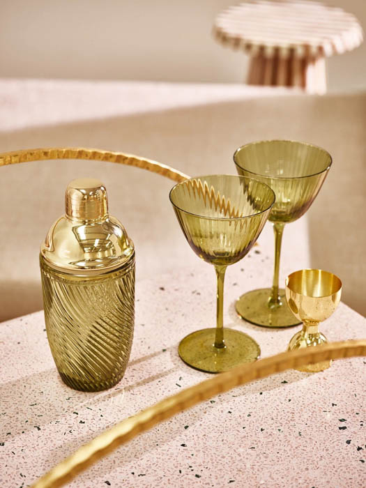 If you fancy trying it at home, pour, mix and serve the ingredients using an absinthe-coloured green glass shaker, a jigger and two martini glass set, €54.00, from Oliver Bonas.