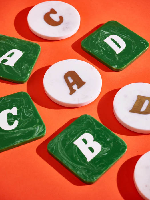 Other bar accessories worth bringing colour to the occasion include Ola alphabet coasters, €11.50 each, from Oliver Bonas.