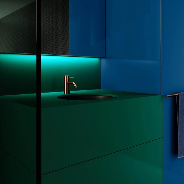 Optica is a vanity unit with two drawers and a countertop by Rocca that offers an easy way to bring in a pop of colour.